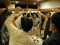![]() クイズが終わる頃、お料理が運ばれてきました。 日本酒に合う料理が並び、皆のお酒もすすみます。 ![]() 緑川の春の限定酒「霞しぼり」という薄にごり生酒も持ってきていただきました。 ビンを傾けると滑らかなオリが花びらのように舞い、風に吹かれる桜を思わせるお酒です。 味もさわやかでGood! ![]() 旨い日本酒が出てくるので、ついつい飲み過ぎちゃった…。 とうとう、シャツと顔の色が同じに! ![]() 空いたビンの蓋もこんなにたくさん。 ![]() そんな中、シバタ君と高橋さんは各テーブルを回り日本酒の解説に大忙し。 合間に利き酒クイズの答えあわせ。 ホント、休む暇もありません。 ![]() 最後に、残ったお酒を集めてじゃんけん争奪戦! ![]() 「欲しい人〜」「は〜い!!」 次々とお土産の日本酒がさばかれていきます。 ![]() しかし実は、参加者達はずーっと気になっていたことがありました。 「あの緑川前掛け、俺も欲しかったなぁ…」 ![]() と、思って高橋さんに伺ったところ、 賞品として用意した緑川グッズがまだありました! よーし、最後に勝負! ![]() じゃ〜んけ〜んぽん! ![]() 見事ゲット!「やった〜。マジで嬉しい!!」 最後まで盛り上がり、大満足の参加者たち。 皆様、どうもお疲れさまでした。 ![]() 今回も大成功! 次もまた参加して下さいね〜! by シバタ その後、二次会になだれ込んだシバタ君ご一行。 ますます勢いが増し、なんとこの店の緑川を飲みつくしたのでした(マジ) 『なごやか銘酒会』の様子を知りたい方はこちら! |